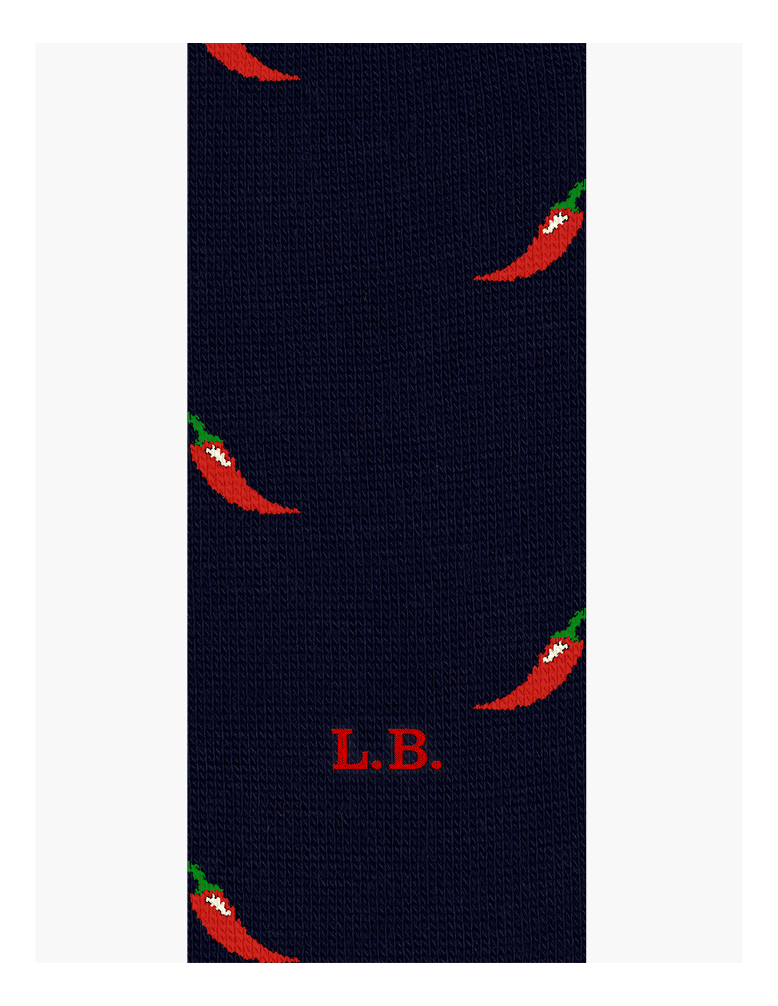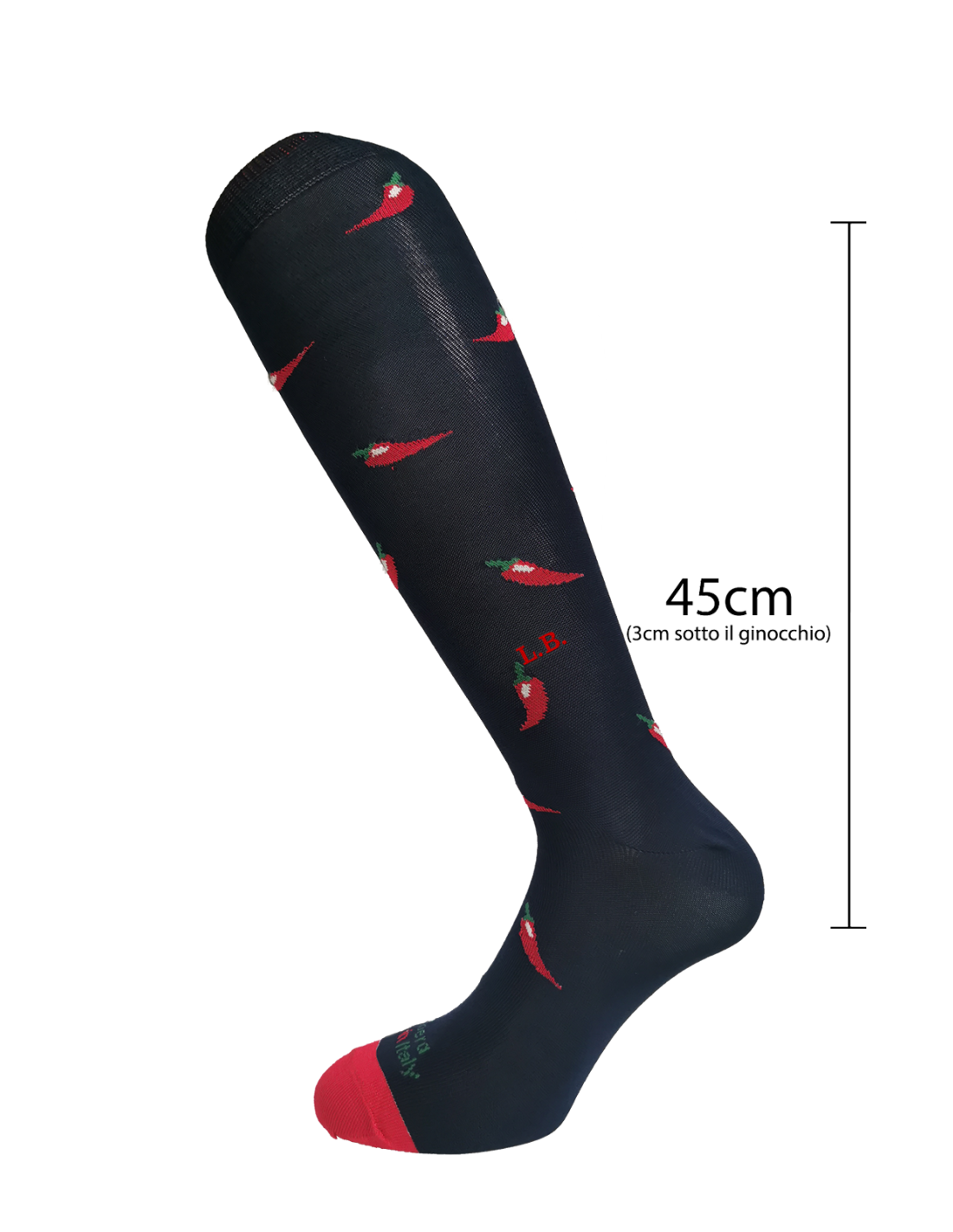 Eleganti calze in Cotone Caldo originale 100% fantasia Peperoncino personalizzabile con iniziali, il ricamo delle iniziali viene effettuato solo sul calzino sinistro, all'altezza della caviglia, con particolari caratteri classici Corsivo o Stampatello in una grandezza non troppo invasiva ma percettibile.