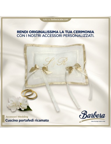 Raffinato cuscino portafedi in lino 100% italiano, perfetto per rendere speciale il momento dello scambio degli anelli. Realizzato con materiali di alta qualità e lavorazione artigianale, è impreziosito da ricami personalizzabili e delicati nastri in raso color champagne per fissare con eleganza le fedi. Pensato per cerimonie romantiche e tradizionali, aggiunge un tocco di classe e significato a uno dei momenti più importanti del matrimonio. Misura circa 23x15 cm. Spedizione gratuita con consegna garantita in 8 giorni lavorativi. Celebra il tuo amore con un prodotto curato nei minimi dettagli, 100% made in Italy.