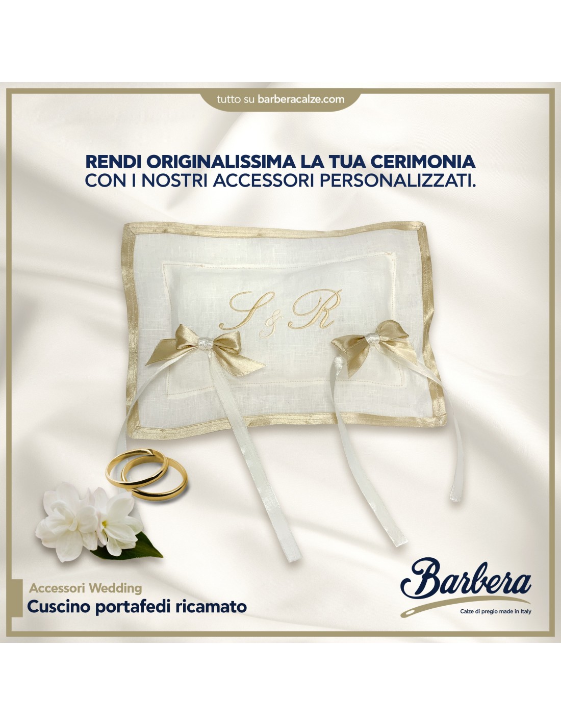 La lavorazione italiana, garanzia di stile e durabilità, si riflette nei ricami dorati personalizzati e nei delicati nastri in raso color champagne, ideali per assicurare le fedi con grazia e sicurezza. Il cuscino è progettato per accompagnare con discrezione e bellezza uno dei momenti più intensi della cerimonia: l’ingresso degli anelli, simbolo eterno dell’amore.
